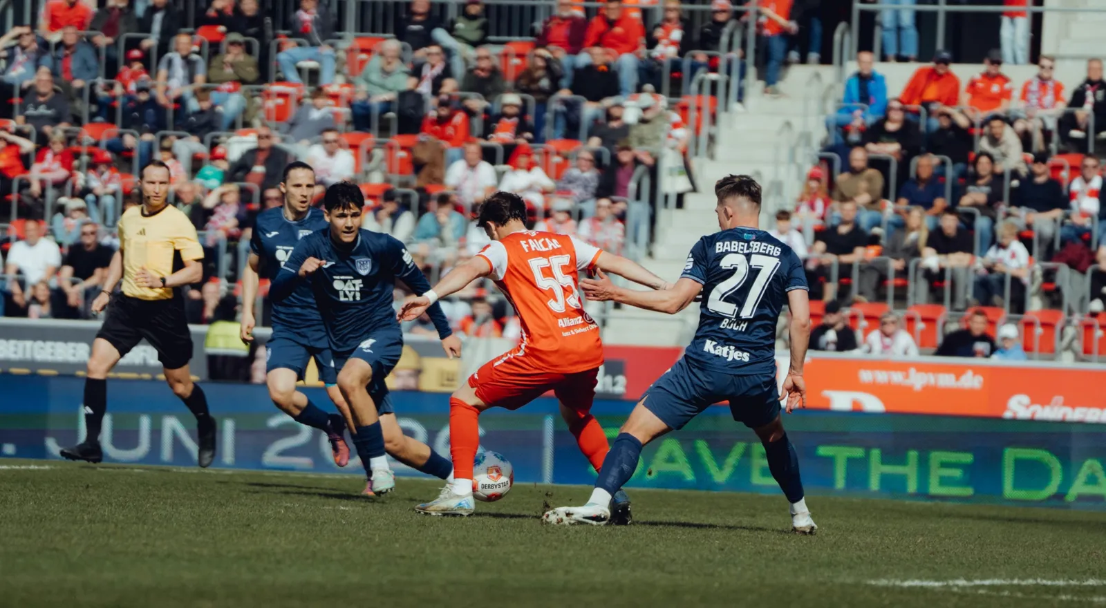 Unsere Equipe musste sich am 29. Spieltag beim FC Rot-Weiß Erfurt mit 2:4 geschlagen geben. In einer intensiven und ereignisreichen Partie zeigte das Team nach Rückschlägen starke Reaktionen und gab sich bis zum Schluss nicht auf. Rückstand und Antwort durch Hasse Wir kamen gut in die Partie und hatten durch Nino Lessel die erste Möglichkeit, der das Außennetz streifte. Doch in Führung gingen wenig später die Erfurter mit ihrer ersten gefährlichen Aktion: Marco Wolf traf per Freistoß in der 9. Minute. In der Folge überstanden wir eine druckvolle Phase der Erfurter und fanden anschließend wieder besser ins Spiel. Eine kuriose Szene gab es dabei bereits zuvor: Nach einer Flanke kam Tobias Hasse aus spitzem Winkel zum Abschluss, doch Keeper Jaden Rodtnick hielt den Ball spektakulär am Pfosten mit dem Bauch fest. Wenig später machten wir es dann besser: Über mehrere Stationen kam der Ball erneut zu Hasse, der diesmal zum verdienten 1:1 einschob. Bis zur Pause hatten wir immer wieder Möglichkeiten, unter anderem durch George Didoss und Theo Ogbidi, doch es blieb beim 1:1. Rückschlag in Unterzahl aber, Nulldrei bleibt dran Nach dem Seitenwechsel traten wir mutig auf und suchten weiter den Weg nach vorn. Doch eine rote Karte für Kenny Weyh, der Marco Wolf von hinten wegrätschte, hat unsere Mannschaft in Unterzahl gebracht. Erfurt nutzte die neue Situation und ging erneut durch Til Linus Schwarz in der 55. Minute in Führung. Kurz darauf eehöhten doe Gastgeber durch Raphael Assibey-Mensah in der 66. Minute auf 3:1. Trotz des Rückstands und der Unterzahl gab sich unsere Equipe nicht auf. Wir spielten weiter offensiv und suchten unsere Chancen. Nach einer Kombination von Marco Perovic gelang dem eingewechselten Gian Luca Schulz der Anschlusstreffer zum 2:3. Plötzlich war wieder alles möglich. Das Team blieb mutig und drängte auf den Ausgleich. George Didoss hatte die große Chance zum 3:3, traf jedoch nur den Pfosten. Im direkten Gegenzug nutzten die Gastgeber einen Konter durch Obed Chidindu Ugondu zum 4:2 und entschieden damit die Partie. Trotz der Niederlage zeigte die Mannschaft eine starke Moral, spielte auch in Unterzahl weiter offensiv stark und ließ sich zu keinem Zeitpunkt hängen. Auf dieser Leistung lässt sich für die kommenden Aufgaben aufbauen. Weiter geht es für uns am Freitag im KarLi gegen den FSV 63 Luckenwalde. Zuschauer*innen: K.A. SV Babelsberg 03: Babke – Silic, Lang (46. Weyh), Wegener (76. Perovic), Müller (76. Schulz), Covic (62. Schmidt), Lessel, Didoss, Hasse, Ogbidi (62. Queißer), Büch FC Rot-Weiß Erfurt: Rodtnick – Schwarz (76. Mashigo), Fuakala, Awoudja, Assibey-Mensah (67. Falcao), Caciel (67. Boboy), Wolf, Soares (18. Fehler), Clexton, Dehl, Durakov (67. Ugondu) Tore: 1:0 Wolf, 1:1 Hasse, 2:1 Schwarz, 3:1 Assibey-Mensah, 3:2 Schulz, 4:2 Ugondu Rote Karte: Kenny Weyh